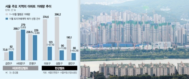 지난 10월 15일 대책 시행 이후 서울 강남 3구와 한강벨트(용산·마포·성동·광진·동작구) 아파트 거래량은 이전의 절반 수준으로 급감했다. 서울 각 자치구 새올전자민원창구 접수 민원을 분석한 결과, 11월 강남 3구 및 한강벨트 지역의 토지거래계약 허가 신청 건수는 1215건으로, 이전 10개월 월평균 거래량(2515건) 대비 51.7%나 줄었다. 15억 원 초과 아파트에 대한 대출 규제 강화가 고가 아파트 밀집 지역에 직접적인 영향을 미친 것으로 풀이된다.